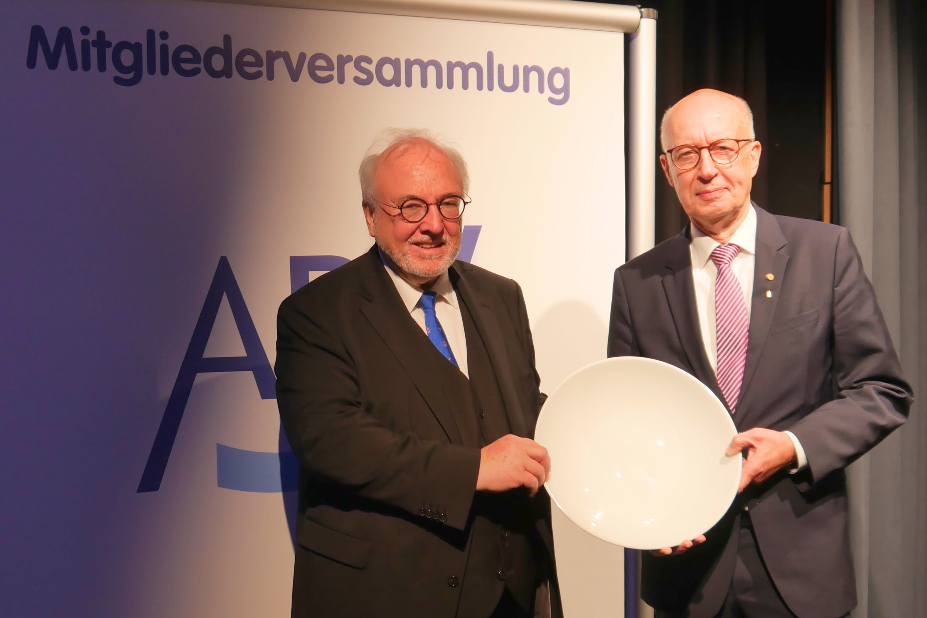Herr Dr. Richard Herrmann und Herr Karl-Heinz Weis wurden anlässlich der jüngsten ABV-Mitgliederversammlung durch den Vorstandsvorsitzenden, Herr Rudulf Henke, mit der ABV-Ehrenschale ausgezeichnet. Die Ehrenschale ist die höchste Auszeichnung des Spitzenverbandes der berufsständischen Versorgungswerke in Deutschland. Sie besteht aus weißem Porzellan der Königlichen Porzellanmanufaktur KPM. Die Unterseite trägt eine Widmung.